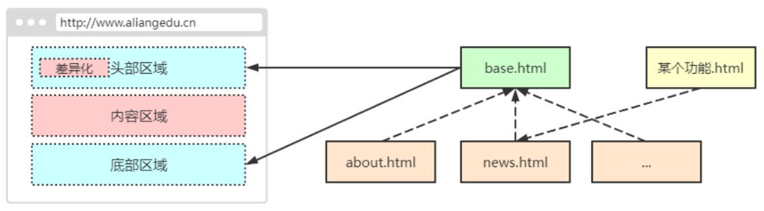 {% extends ‘base.html’ %}3、在基础模板预留子模板差异化内容