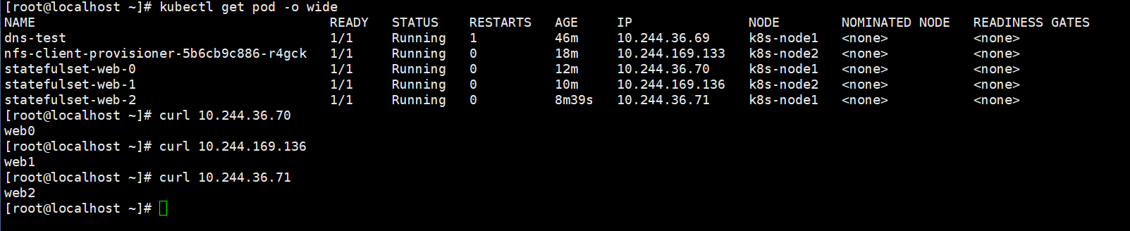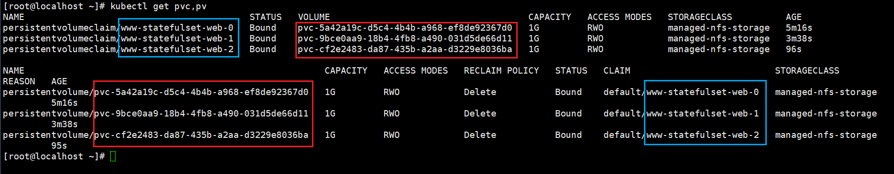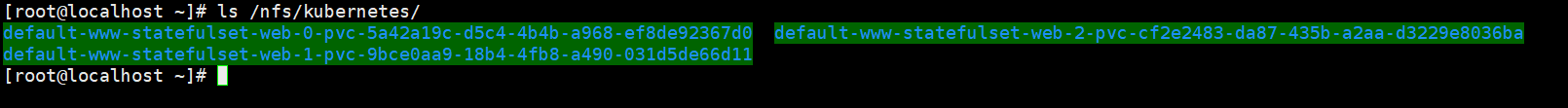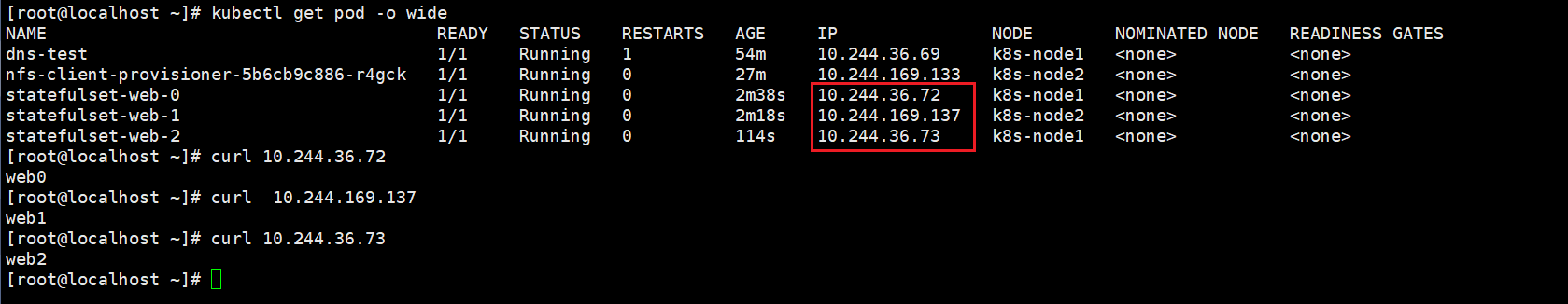 从上图可以看出,重建之后,数据还是之前的数据,每个pvc对应绑定每个pv,pod的IP发生了变化。