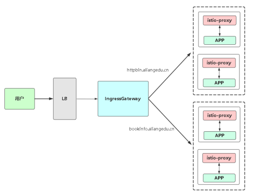 在实际部署中,K8s集群一般部署在内网,为了将暴露到互联 网,会在前面加一层负载均衡器(公有云LB产品、Nginx、 LVS等),用于流量入口,将用户访问的域名传递给 IngressGateway,IngressGateway再转发到不同应用。
