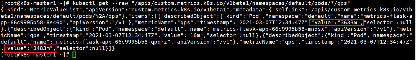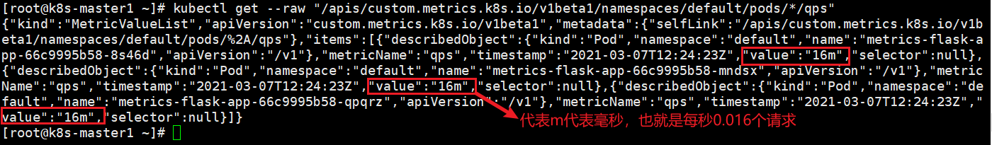 kubectl get --raw "/apis/custom.metrics.k8s.io/v1beta1/namespaces/default/pods/*/qps"如果配置没问题,会返回JSON数据,注意里面的value字段,HPA控制器会拿这个值计算然后比对阈值。这个值单位是m,表示 毫秒,千分之一,例如值为500m是每秒0.5个请求,10000m是每秒10个请求(并发)。