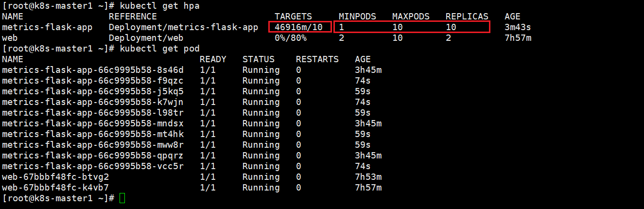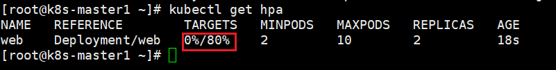 kubectl get hpa说明:为名为web的deployment创建一个HPA对象,目标CPU使用率为80%,副本数量配置为2到10之间。