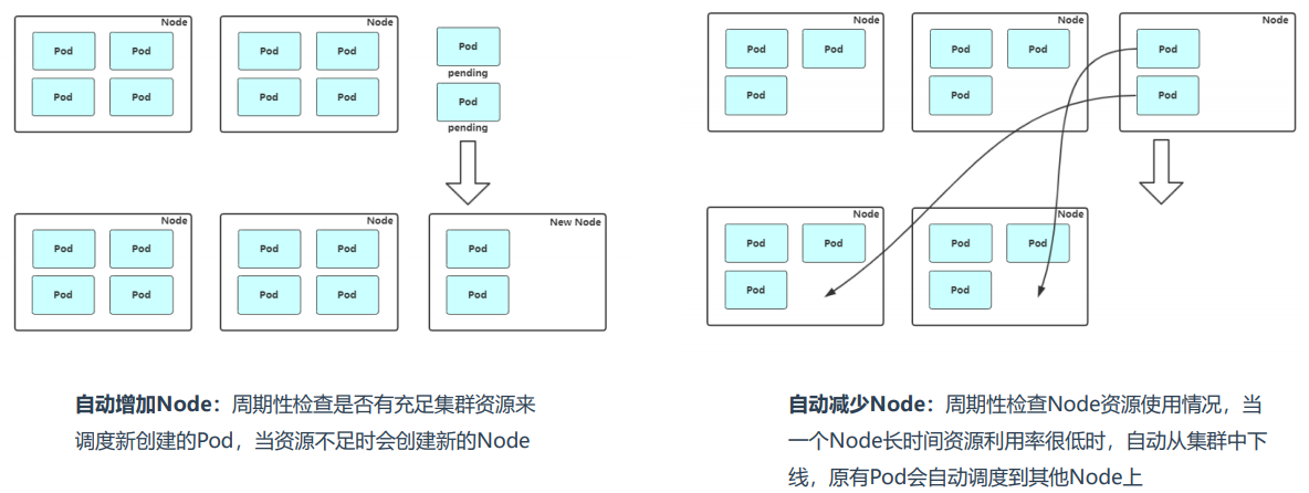 - 自研发:根据Node监控指标或者Pod调度状态判断是否增加Node,需要一定开发成本