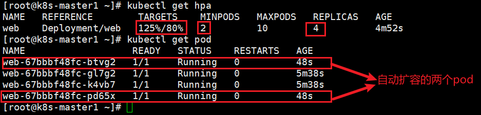 ab -n 300000 -c 1000 http://10.0.0.236/index.html # 总30w请求,并发10004、观察扩容状态
