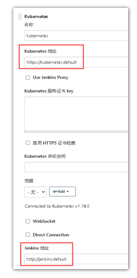 配置插件:管理Jenkins->管理Nodes和云->管理云->添加Kubernetes