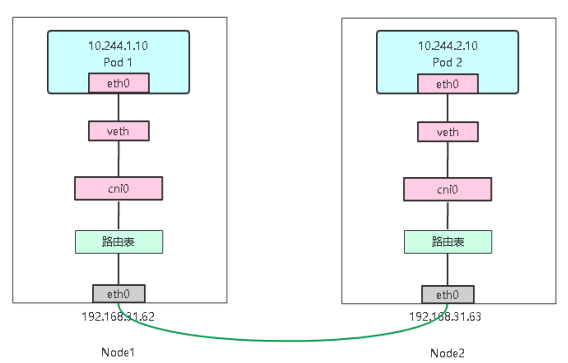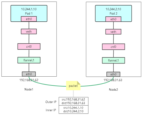 如果Pod 1访问Pod 2,源地址10.244.1.10,目的地址10.244.2.10 ,数据包传输流程如下: