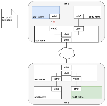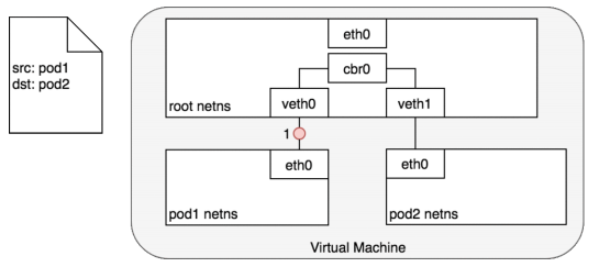 2.网桥 cbr0 中为 veth0 配置了一个网段。一旦 数据包到达网桥,网桥使用ARP 协议解析出其 正确的目标网段 veth1;
