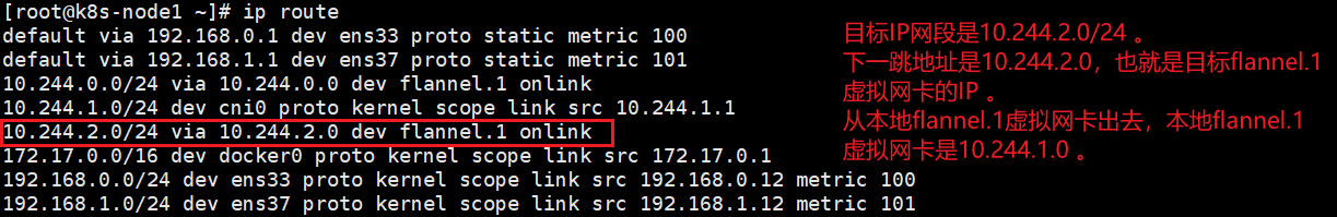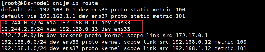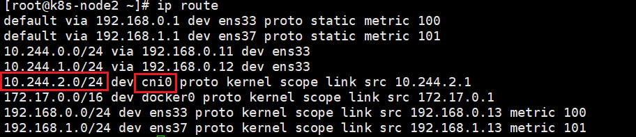 目的 IP 地址属于 10.244.2.0/24 网段的 IP 包,应该经过本机的 eth33 设备发出去(即:dev ens33);并且,它下一跳地址是 192.168.0.13(即:via 192.168.0.13)。
