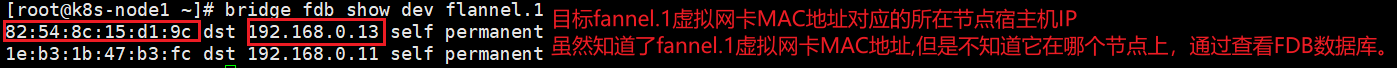 5.封装到UDP包发出去:在封装成宿主机网络可传输的数据帧时,还缺少目标宿主机MAC地址,也就是说这个UDP包该发给哪台宿主机呢? flanneld进程也维护着一个叫做FDB的转发数据库,可以通过bridge fdb show dev flannel.1命令查看。可以看到,上面用的对方flannel.1的MAC地址 对应宿主机IP,也就是UDP要发往的目的地。所以使用这个目的IP与MAC地址进行封装。