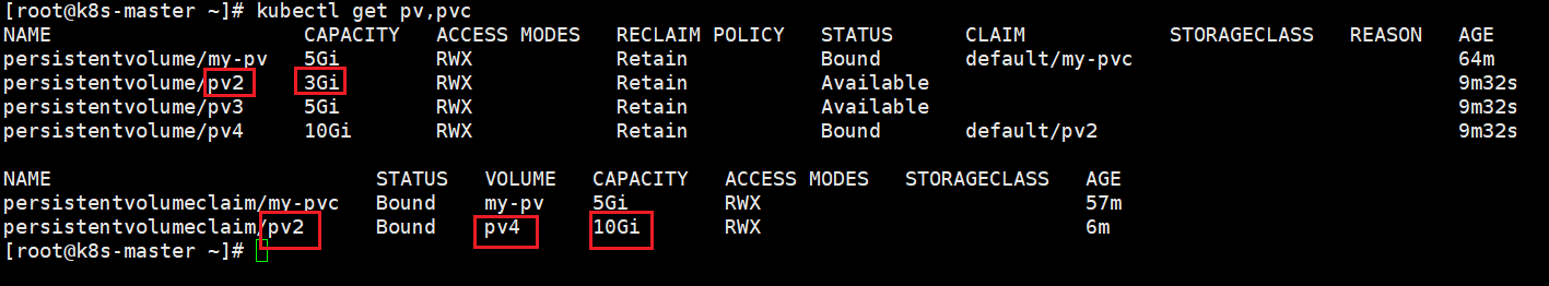 从上面pvc234-deployment.yaml 文件配置可以看到,配置文件指定的pvc是pv2,使用最大容量是8Gi,但是pv2的容量可以看到是3Gi,并不满足你要使用的容量,但是为了尽可能的分配给你,所以它将pv4指定了给你使用,pv4的容量是10Gi。