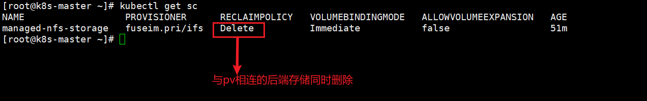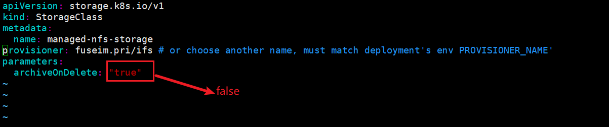从上面可以看出,nfs的回收策略是deployment删除后端的存储也同时删除,但是当我们把deployment删除之后,数据共享目录还在,并没有删除,它只是帮我们把数据共享目录归档了,如果要删除需要修改class.yaml 配置文件中的archiveOnDelete为false,这时就会帮我们删除后端数据共享目录。