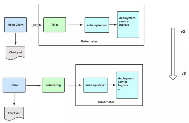 2019年11月Helm团队发布v3版本,相比v2版本最 大变化是将Tiller删除,并将大部分代码重构。