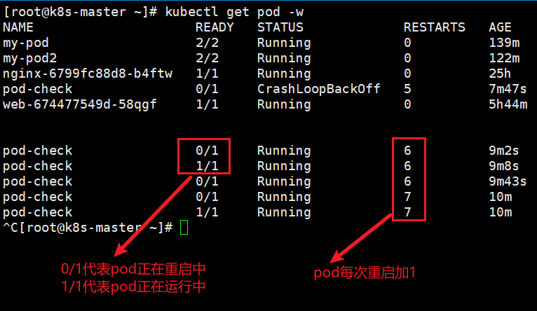 kubectl get pod -w #实时验证pod的重启次数是否增加