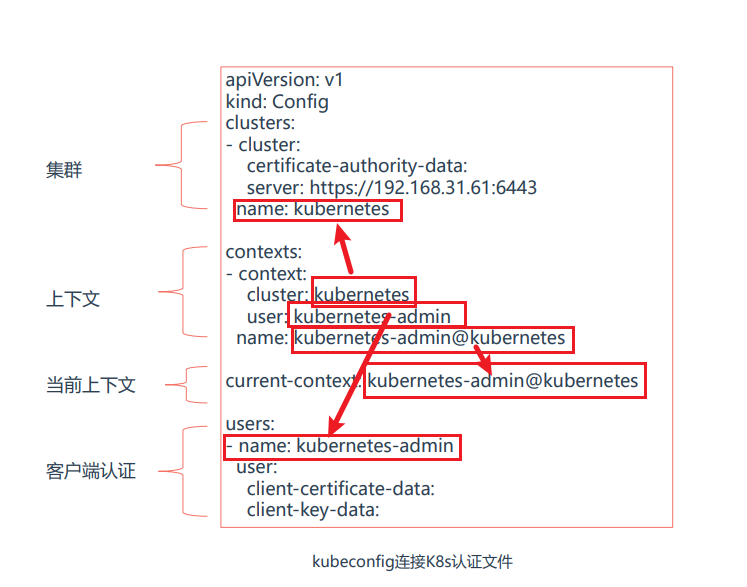 scp .kube/config root@192.168.0.12:.kube/kubectl使用kubeconfig认证文件连接K8s集群, 使用kubectl config指令生成kubeconfig文件。