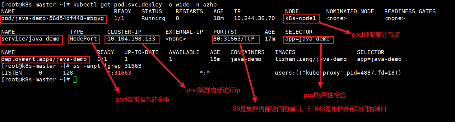 kubectl expose deployment java-demo --port 80 --target-port=8080 --type=NodePort -n azhe4、列出命名空间下指定标签pod