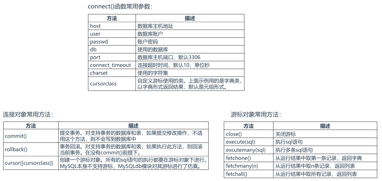 pymysql是Python中操作MySQL的模块,其使用方法和MySQLdb几乎相同。但目前pymysql 支持python3.x而后者不支持3.x版本。