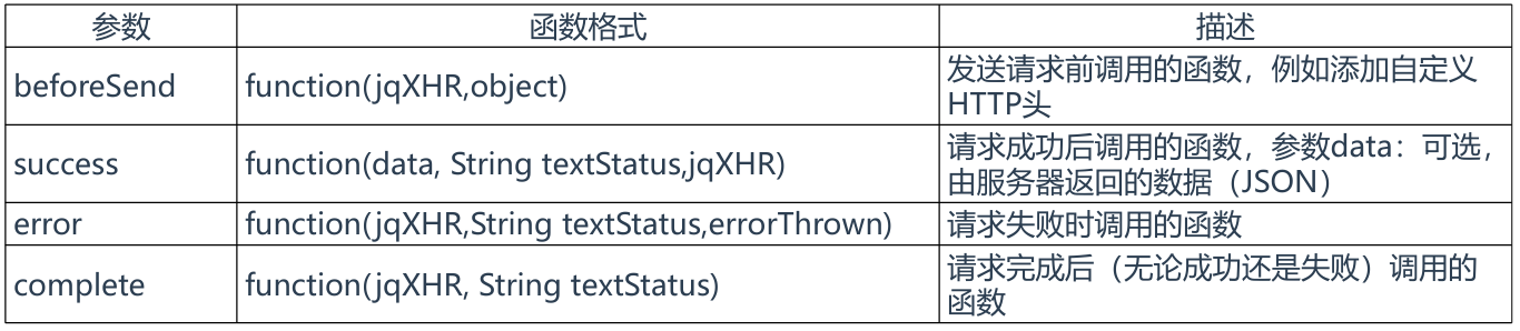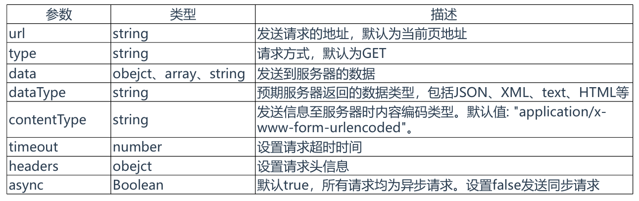 settings 是$.ajax ( )方法的参数列表,用于配置 Ajax 请求的键值对集合,参数如下: