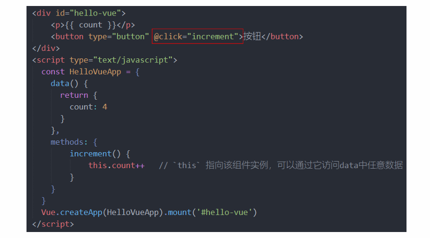 在methods选项中定义的方法与data选项中的数据一样,可以在组件的模板中使用。