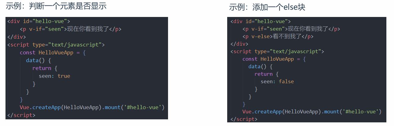 这里,v-if 指令将根据表达式seen 的值的真假来插入/移除元素。