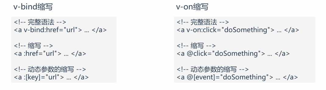 因此,Vue 为v-bind 和 v-on 这两个最常用的指令,提供了特定简写: